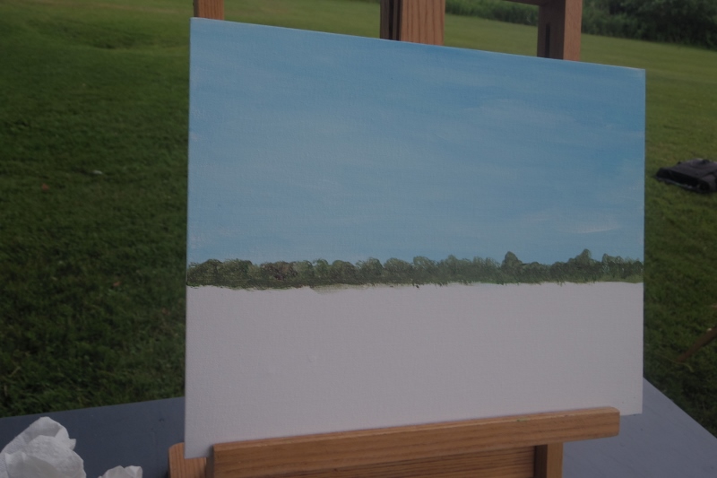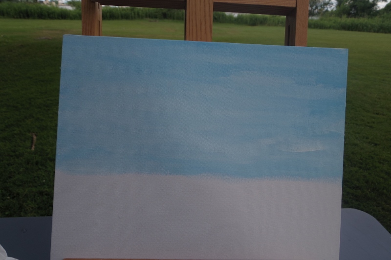 Once we started painting, however, it had stopped raining. At one point, I felt a single raindrop while I painted but that was it. There were about twenty students and we all looked toward the river as we painted. Our painting was to include the sky, the river, the trees, and the weeds. We started with the sky. The paint that you use to make the sky is a mixture of white and blue. You paint until you reach the horizon line. Above is my painting with the sky added.