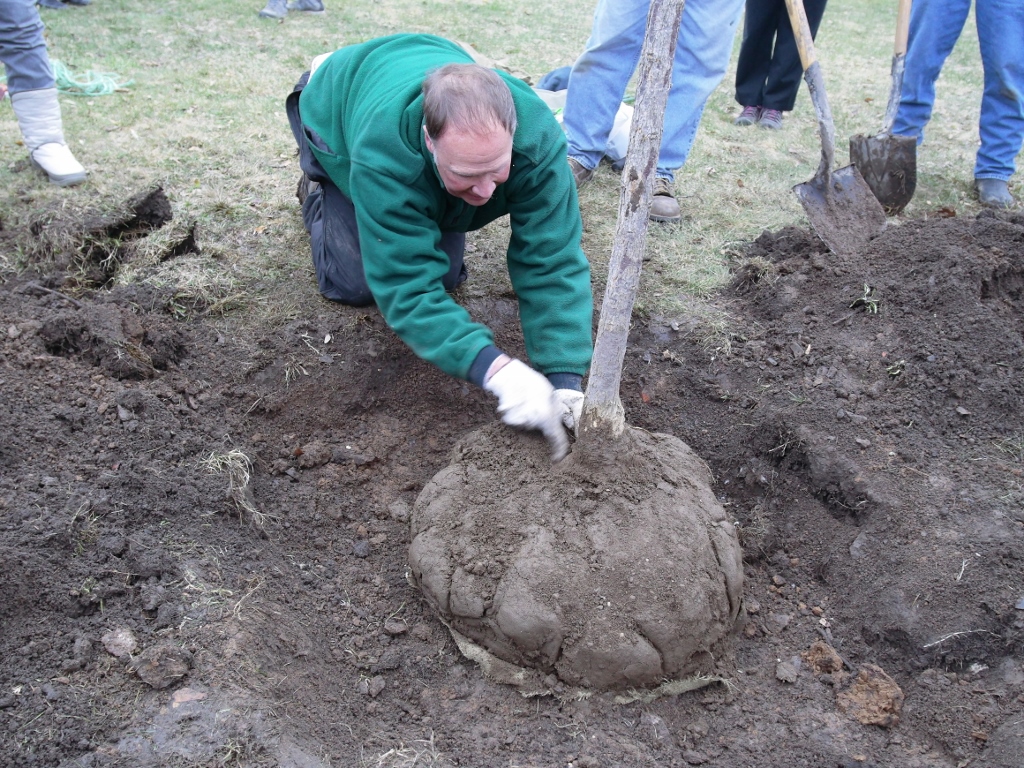 The hole was measured a few times before it was determined to be the right height and width for the tree. The tree was placed in its new home and was checked to make sure that was straight. Soil was placed around the root ball, which was still wrapped in burlap and with much of its wire cage still intact. Eventually, the wire cage was removed, as well as the top portion of the burlap. The burlap underneath the root ball was left, as it will degrade within a few years.