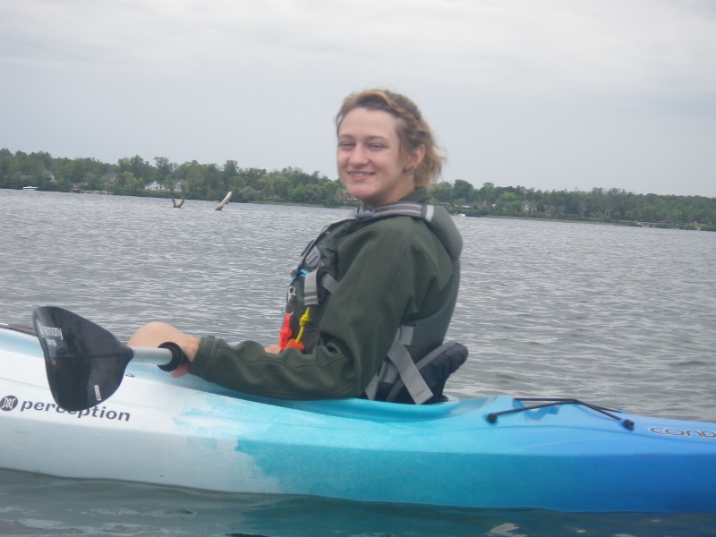 Encouraged by Mary’s ringing endorsement of the try out a kayak event, I decided to do the same. I saw two kayak instructors: Tina and Kelly. There was another person asking them about kayaking lessons. That person didn’t want an immediate lesson. She said that she would come back. She removed the life jacket that she was wearing. I asked Tina if there was some time during the day that I could have a lesson. She said, “How about right now?” I agreed that having a lesson at once would be a good idea. She handed me the other person’s life jacket but it was very large. Then she handed me a child-sized jacket. I somehow managed to get it on but it was cut-off-your-air-supply tight. I’m glad that I wasn’t around in the nineteenth century because I’m sure that I would not like wearing a corset. I was relieved to remove that tiny jacket. The third jacket was… just right!