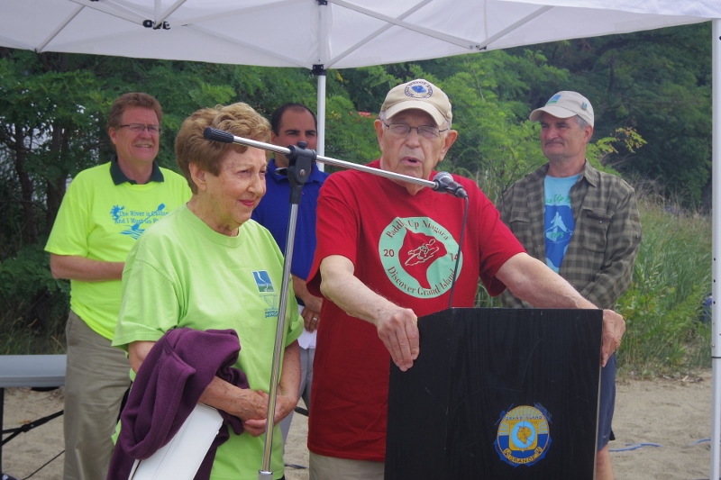 The man at the microphone is Frank Levin, a retired real estate investor. He is joined by his wife, Jeanette. In the early 1990s, when Strawberry Island was nearly disappeared into the river, he, with Jeanette’s support, raised the funds for the restoration of that island. Frank, who recently turned 90, expressed appreciation for being part of the kickoff of this event. He told me about how he got involved with saving this island. He said that Paul Leuchner, who was looking to save the island, called him for help. “If the island were gone, it would create havoc in the river. This had to be done right away. Paul took me out with a group on a cold day (on a boat). We landed, and I took a little walk all by myself. When I came back, he could see the look in my face. He said, ‘You’re gonna do it.’ I said, ‘With my wife’s approval.’ The rest is history, which we’re very happy to be a part of.”