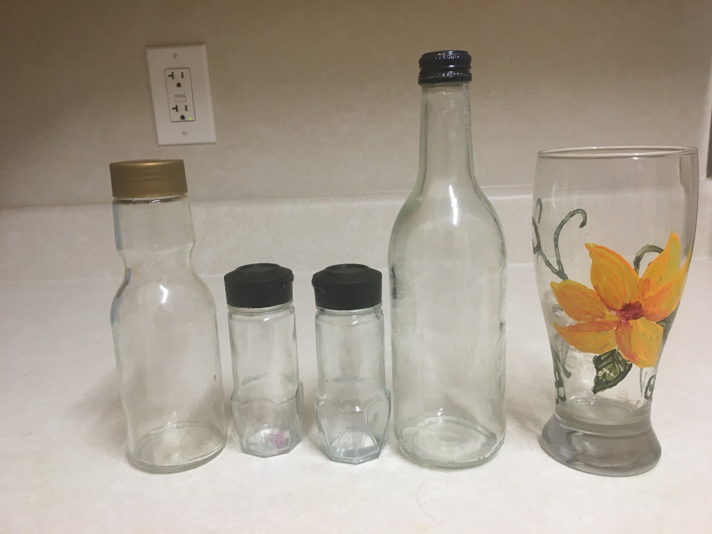 So… the glass jars. I used old spice jars and a jar that had contained a sweet and sour sauce and a bottle that formerly held cooking wine. The biggest job in this whole process is to wash off the paper labels from the jars. I had done that a while ago.