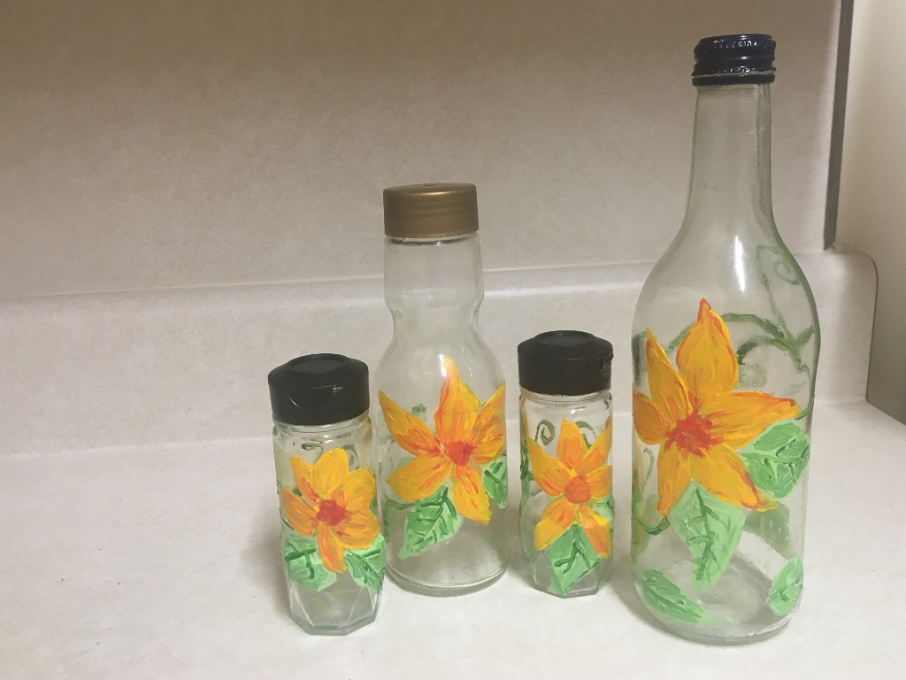 Because I was painting on glass, sketching out my picture with a pencil was not going to be an option. I had to draw with the paintbrush. I started by drawing the petals of the flowers. First I tried using a glass paint that I had bought about a year ago, but I found that I didn’t get much color. So I switched to craft paint. I don’t know if I will be able to wash these jars. Fortunately, I’m not planning on drinking out of them.