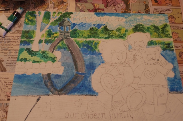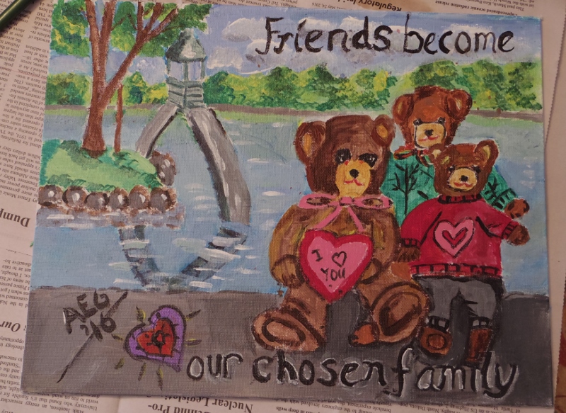 My friend Amy asked me to paint an image that represented the words “Friends become our chosen family.” She wanted the words on the painting, as well. I thought about it for some time. What image would represent those words? I didn’t have a clue. One day, when Amy was visiting, she looked through one of my watercolor sketchbooks and saw that I had made a painting of two bears at Hoyt Lake in Buffalo’s Delaware Park. Amy said that she would like that image to represent her phrase but that she wanted more than two bears in the picture. We agreed that three bears would work well.