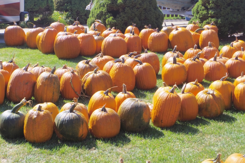 Pumpkins on a lawn a vast array of orange autumn is now here |