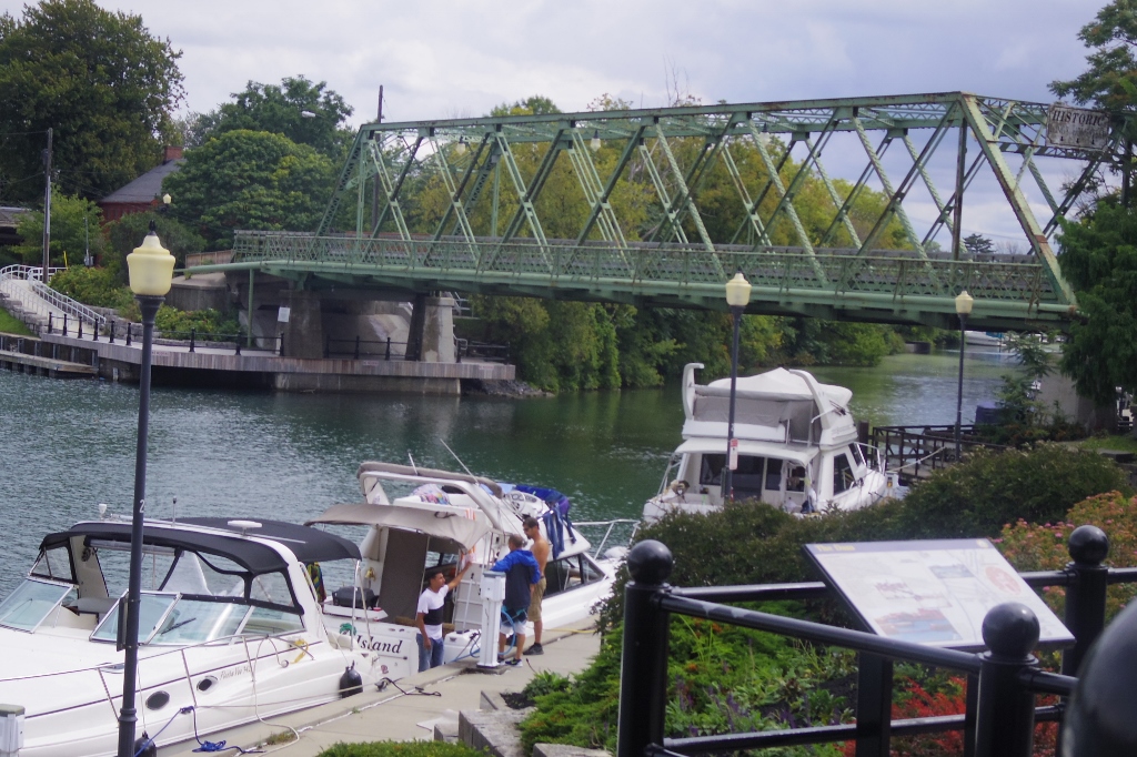 After I left the cemetery, I arrived at the River Oaks Marina. After a little difficulty, I found the ferry, and I was helped aboard by the co-captains, Captain Tom and Captain Erika. I was surprised to find out that I was the only passenger for this adventure. Apparently, some people were dissuaded by the weather. The safety rules were explained to me and off we went, across the Niagara River and into the Erie Canal. It was a smooth trip. The rain had stopped and I was able to take pictures. The boat ride took about fifteen minutes.