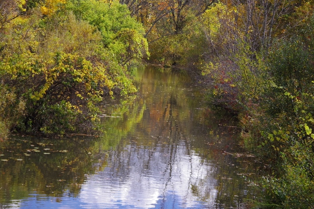 An organic shoreline consists of native plants: perennials, shrubs, and trees. Logs can be placed in the water and some rocks can be used. This is Woods Creek. At this point, its shoreline is covered in perennials, shrubs, and some trees. There are other places where the homeowners who own riparian rights (the shoreline is part of their property) have mowed to the water’s edge. Like the hardened shoreline, the shoreline that has only grass on it is also at increased risk for erosion. That is because, unlike native plants, grass has shallow roots, making it easier to wash away, along with the soil. |