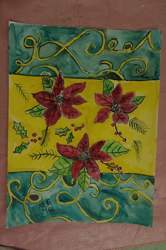 This was a “negative space” painting. I drew one image at a time and painted around them to get this image. The biggest, most prominent flower stands out with this painting technique. |