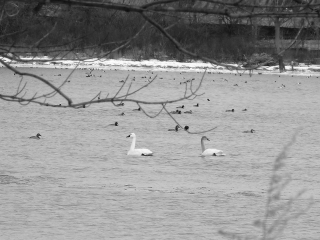 Swans and ducks enjoy a winter day in the river. |