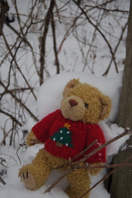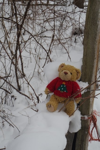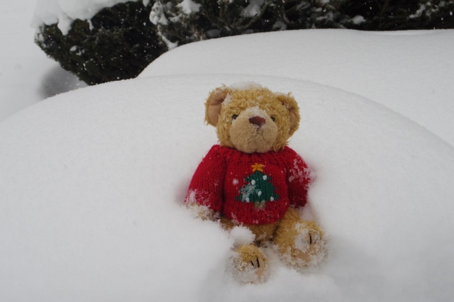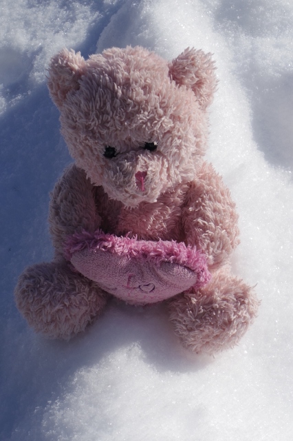 On Friday, Sweet Suzie Bear sits on fresh snow. |