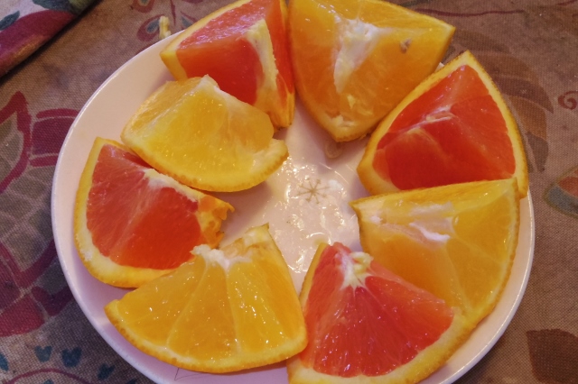 Citrus fruit is wonderful in the winter. Here is an arrangement of two types of orange. They look different and they also have a different flavor. |
