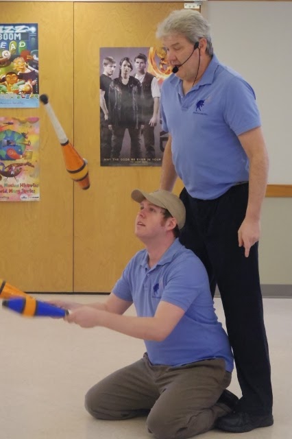Karen and I went to the Grand Island Memorial Library so that I could pick up a book to read for next Monday’s book club meeting (The Paris Architect, by Charles Belfoure.) While we were there, Anne Slater, the children’s librarian, told us about an upcoming performance by Gravitational Bull, a father and son team of jugglers. |