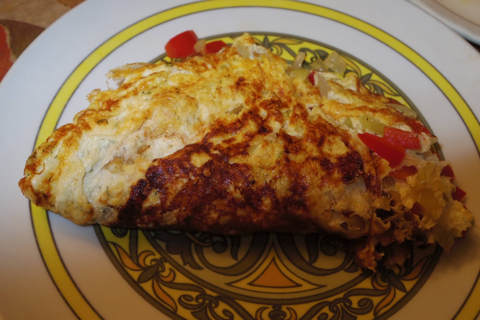 What better way to start the morning than by cooking a lovely omelet? Omelet cooking is a creative process. You can put anything in it that you like. This time, I added red onions, garlic, green peppers, and two types of cheese (parmesan and cheddar). |