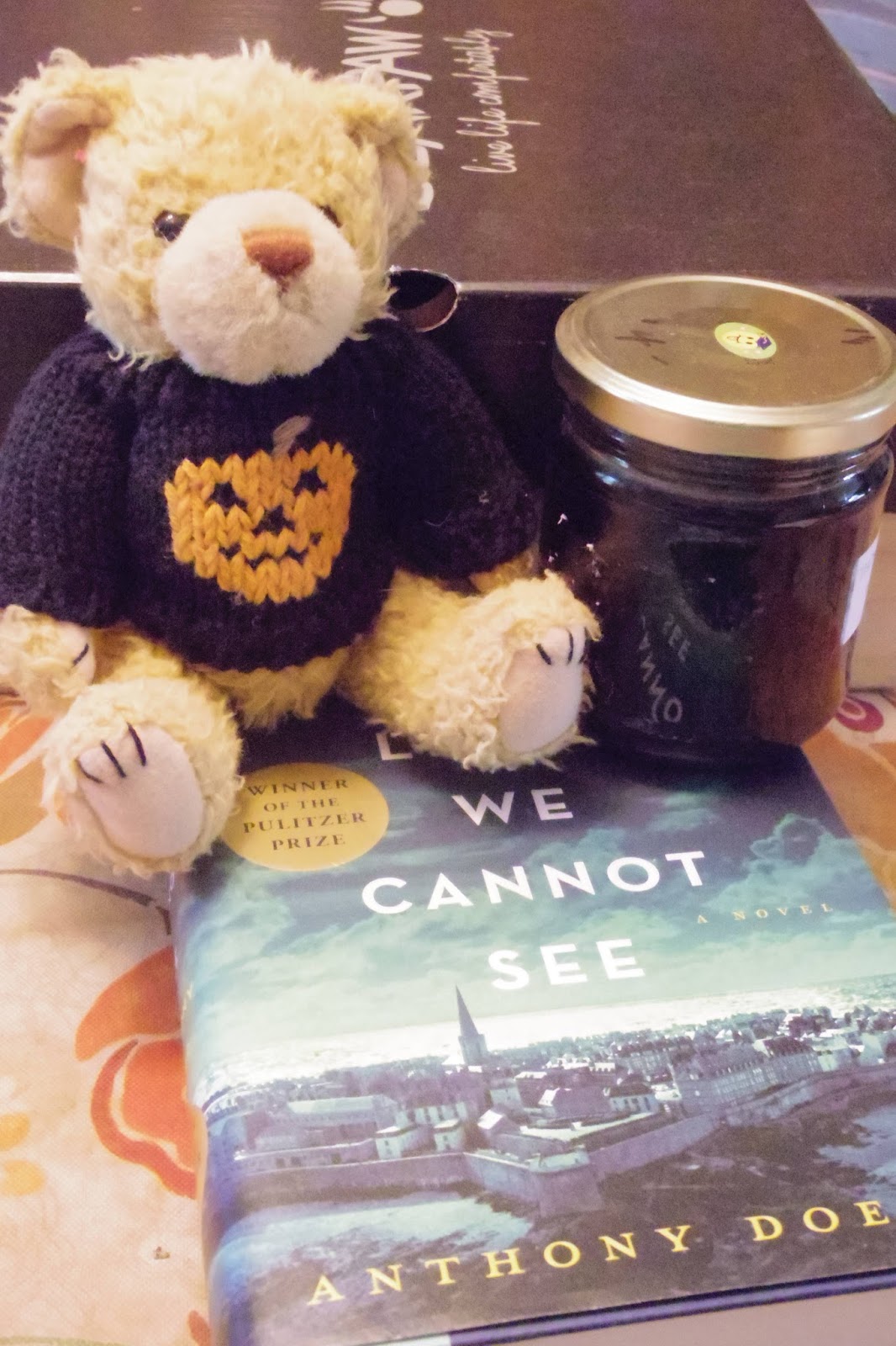 Back at home, the bear enjoys a good book and some delicious dark honey, which I buy from a local beekeeper. |