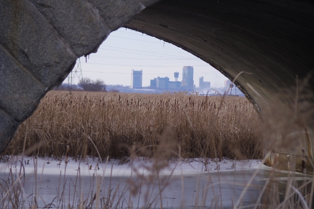 This was the view from under the stone bridge in August. The cattails are vividly green, as is the vegetation in the river.