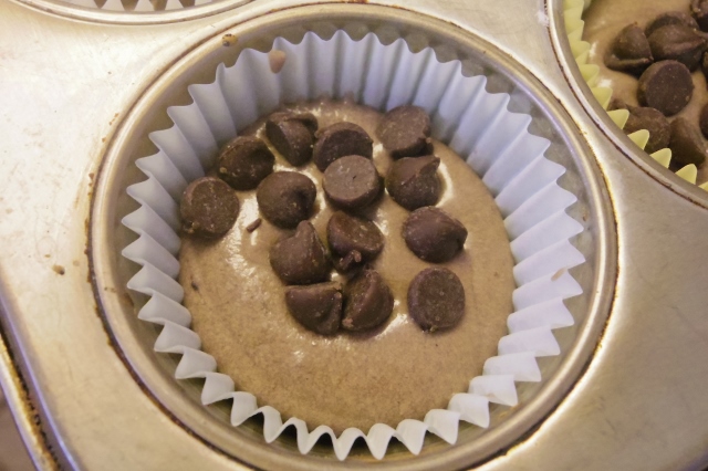| Then I sprinkle dark chocolate chips on top of the batter. |