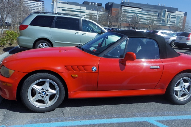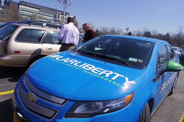 On Friday, I went on a road trip with the Grand Island Historical Society. We traveled to downtown Buffalo in several cars. I was with Curt and his friend. We parked in a downtown parking lot. This electric car was parked next to Curt’s car.
