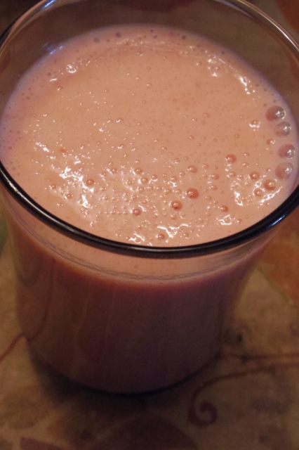On Friday, I made this smoothie for breakfast. The ingredients are: strawberries, raspberries, cantaloupe, plain Greek yogurt, and apple cider. I make it in a food processor. |