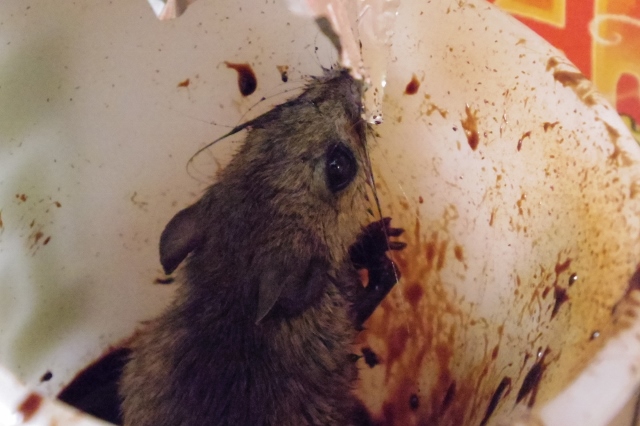 A mouse fell into a cup of old vinegar (used to trap fruit flies). I removed the mouse from the cup and from the house. I washed the mouse off and let it go. |