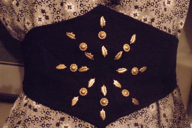 Nineteenth century outfit for a lady with a waist the size of a wasp’s, which ladies tried to produce by wearing very tight corsets. They looked attractive but doctors warned against the practice, saying that the ladies were risking their health and even their lives for fashion.