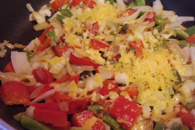 | On Monday morning, I chopped up vegetables and grated cheese for an omelet. I call it my short order cook kitchen fun time. |