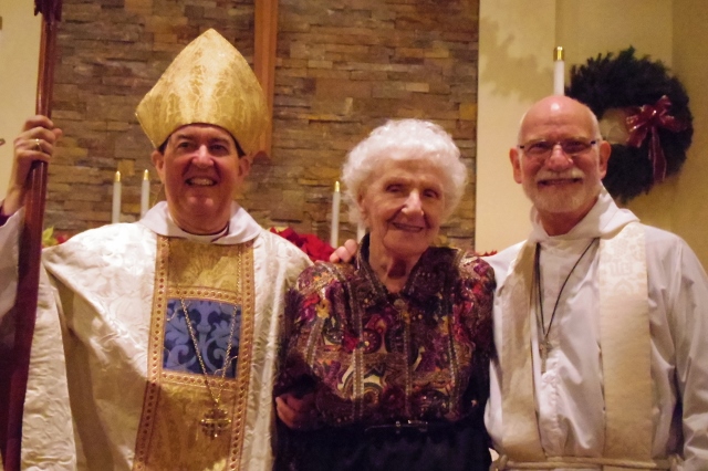Saint Martin in the Fields Church celebrated its 60th anniversary on Grand Island. Bishop William Franklin (aka “Bishop Bill”) came to help Father Earle King and the rest of the congregation celebrate the momentous event. Bishop Bill gave the homily, which he said was “Bishop Bill pretending to be Father Earle pretending to be Bishop Bill.” Wow. That was a bit mind bending. Here are Bishop Bill and Father Earle with Janet Austen, who was one of the original members of Saint Martin in the Fields Church back in 1955. |
