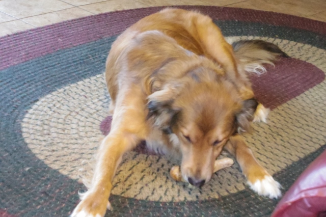 That is quite the fashion statement for the little dog, who has discovered a partially chewed bone. Little dog is determined the conquer this bone. |