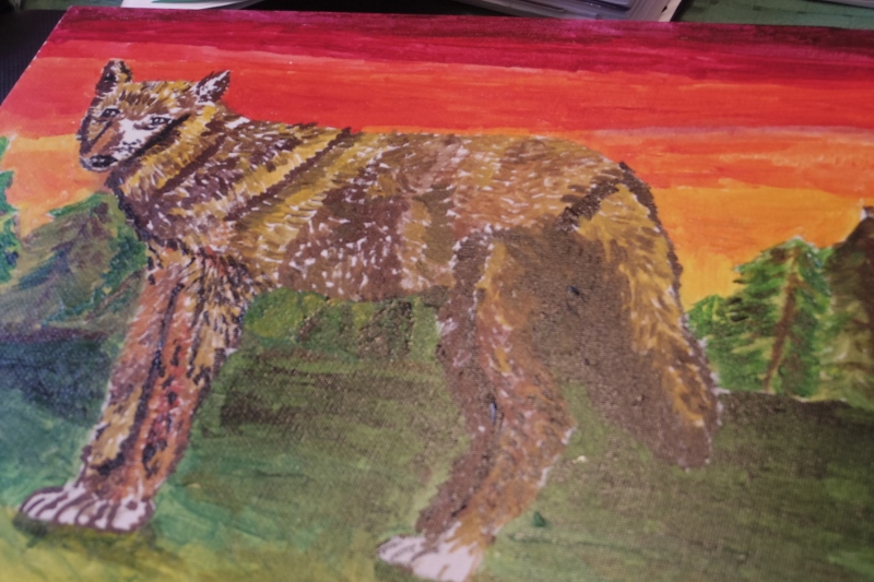Coyote standing against orange sky.