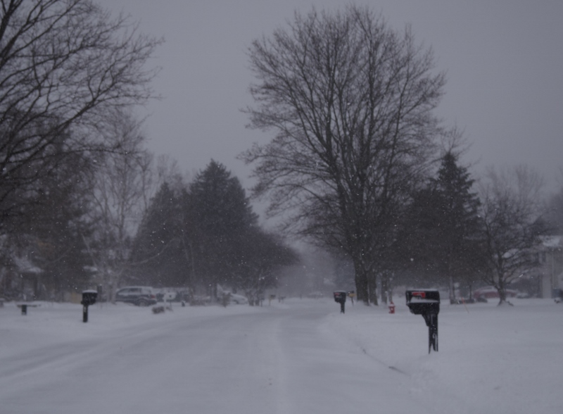 It has been snowing all day. This is the road before it was plowed. Everything was closed down pre-emptively. It probably wasn’t necessary. We did get a good amount of snow over the course of the day, and it is still snowing, but did everything need to be canceled? This is one-point perspective. Everything is pointing toward a single vanishing point.