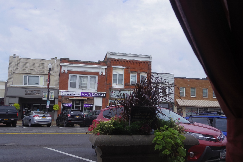 | On Sunday, September 3rd, I rode a ferry from Grand Island to Tonawanda, operated by Niagara River Cruises. The first thing that I did was to go to Lou’s in North Tonawanda for breakfast. This is the view of Webster Street from inside the restaurant. |