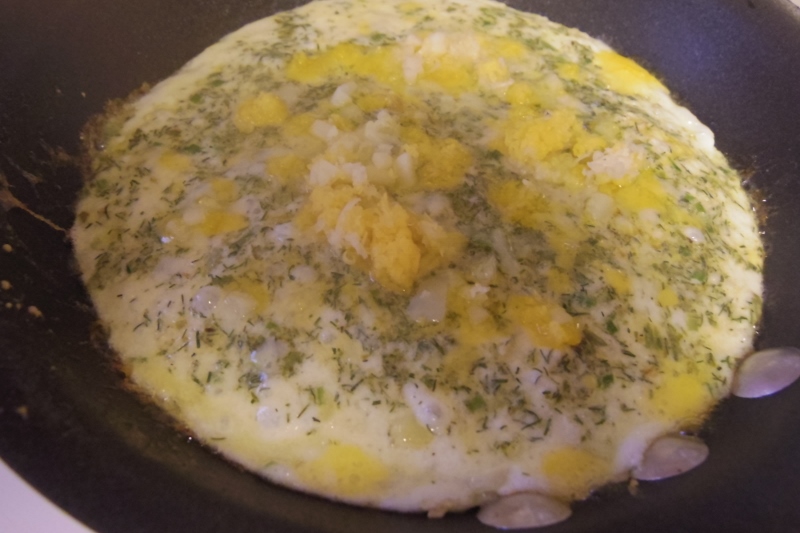 I made two omelets at the same time. This is my mom’s omelet. She likes to have her omelet made with liquid egg whites. They come in a container like a milk container. They are good only for cooking, not for baking because they are pasteurized. If you want to bake something that calls for egg whites, you need to separate eggs.