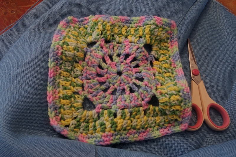 This granny square turned out to be exactly the right size for the phone. I needed to sew a lining for the case, so I chose this very sturdy blue cloth. |