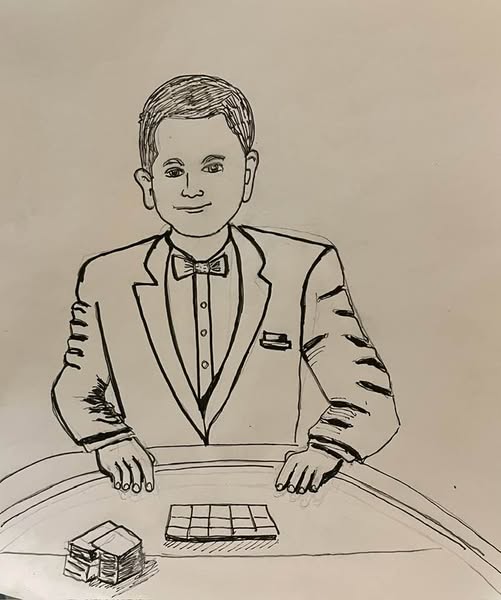 Just then, Wolf discovered that he was sitting at a blackjack table, instead of a canoe. His teenaged nephew had turned into a blackjack dealer, and he began dealing the cards. Wolf looked at his hand. It was an ace of hearts and a king of clubs. Because Wolf was incapable of the famous poker face, he grinned and placed his cards face up on the table.