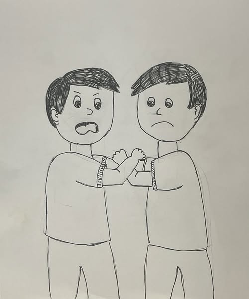 At that moment, the scene shifted yet again to the Land of the Humans. A pair of twins was fighting. When Wolf asked them to stop making noise, they both yelled at him simultaneously. Then they went back to fighting. They each made the same moves as they fought so that neither one had the advantage. Wolf wondered if they were going to fight forever and three days.