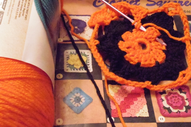 | I chose a pattern from Jean Leinhauser’s book, 101 Crochet Squares, and I started crocheting. I needed to make eight squares for the tote bag. |