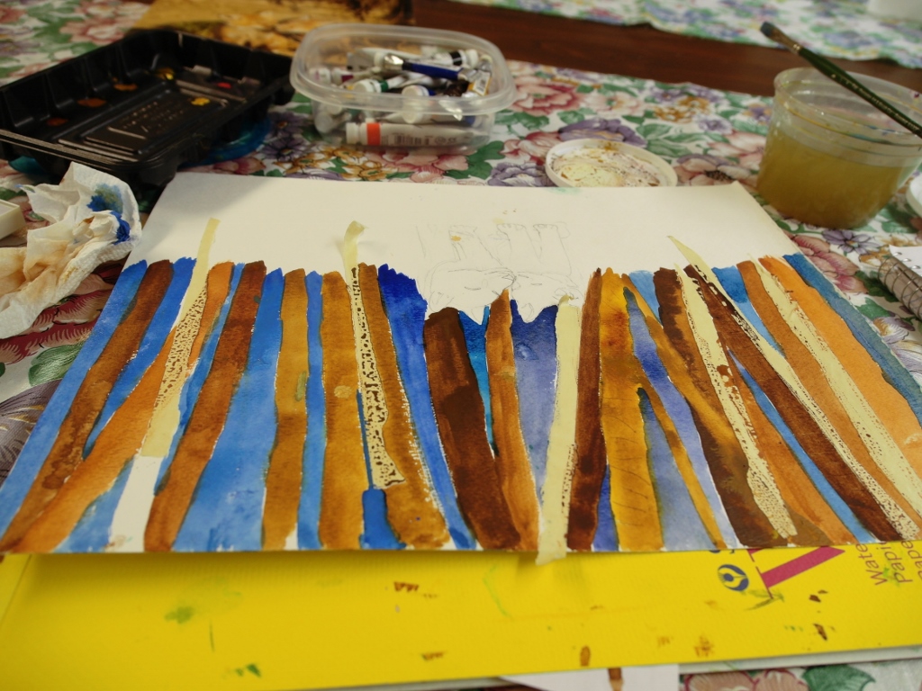 The first thing that I did was to put strips of masking tape on the paper, to mask spaces for birch trees, which are mostly white. Once we had the masking tape in place, the next task was to paint the bank of trees. Virginia suggested that we paint the trees upside down, so that we would be more likely to focus on color and on shapes, rather than on trying to make trees look like trees. So, that’s what I did. |
