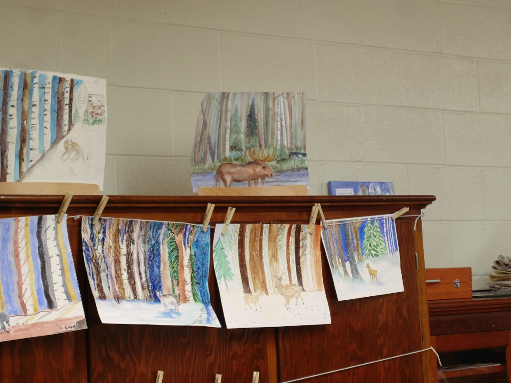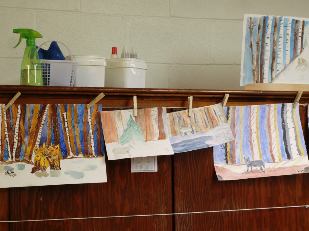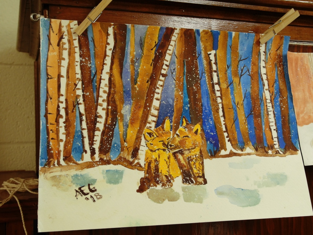 Yesterday, I went to Stella Niagara in Lewiston to paint a snow scene. Specifically, the lesson was to paint a bank of trees with at least one animal in front of the trees. Prior to class, I had drawn two foxes on the page. These animals were young and looked like they were nuzzling. The below photographs show how this painting came to be.