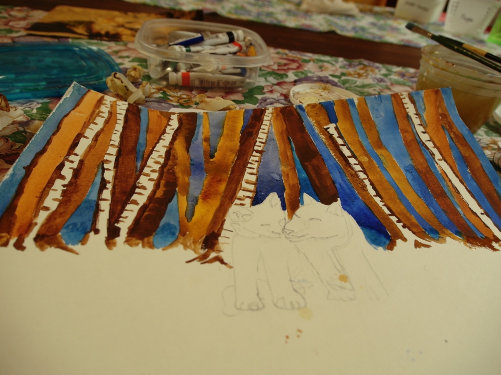It was time to turn the paper around to paint in the animals and to add some shadowing to the snow. |