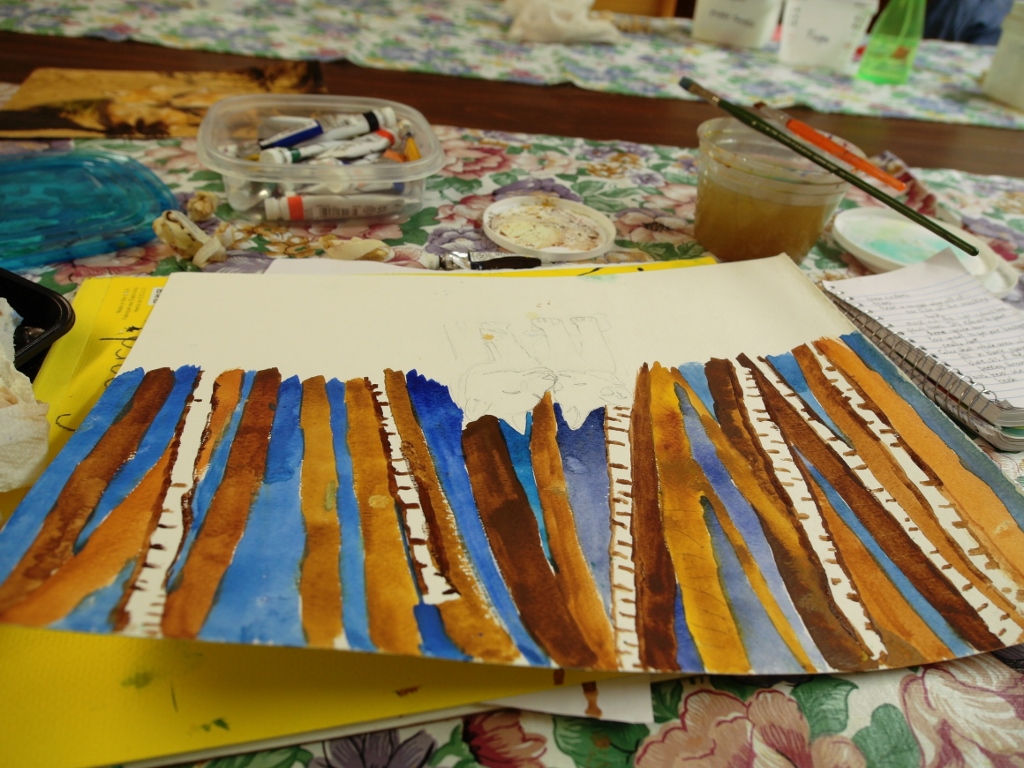 The first thing that I did was to put strips of masking tape on the paper, to mask spaces for birch trees, which are mostly white. Once we had the masking tape in place, the next task was to paint the bank of trees. Virginia suggested that we paint the trees upside down, so that we would be more likely to focus on color and on shapes, rather than on trying to make trees look like trees. So, that’s what I did.