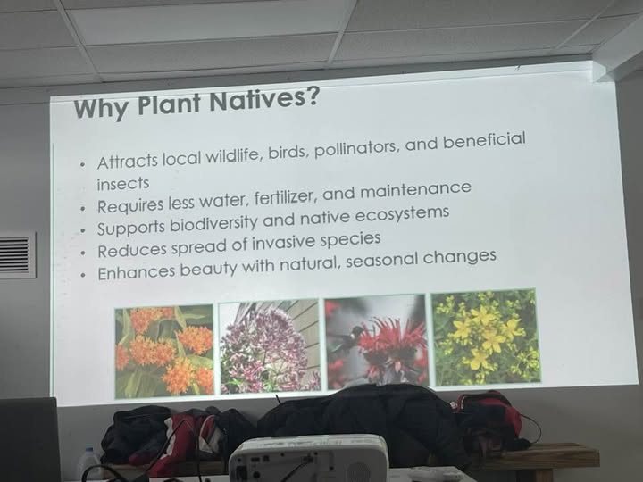 We had two presenters: Sonia Merkel, who talked about how she turned her yard into a pollinator-friendly garden full of native plant species, and Peggy Koppmann, who talked about the benefits of growing native plant species. Some of the benefits are in the below picture, which was one of the images shared in the powerpoint presentation.