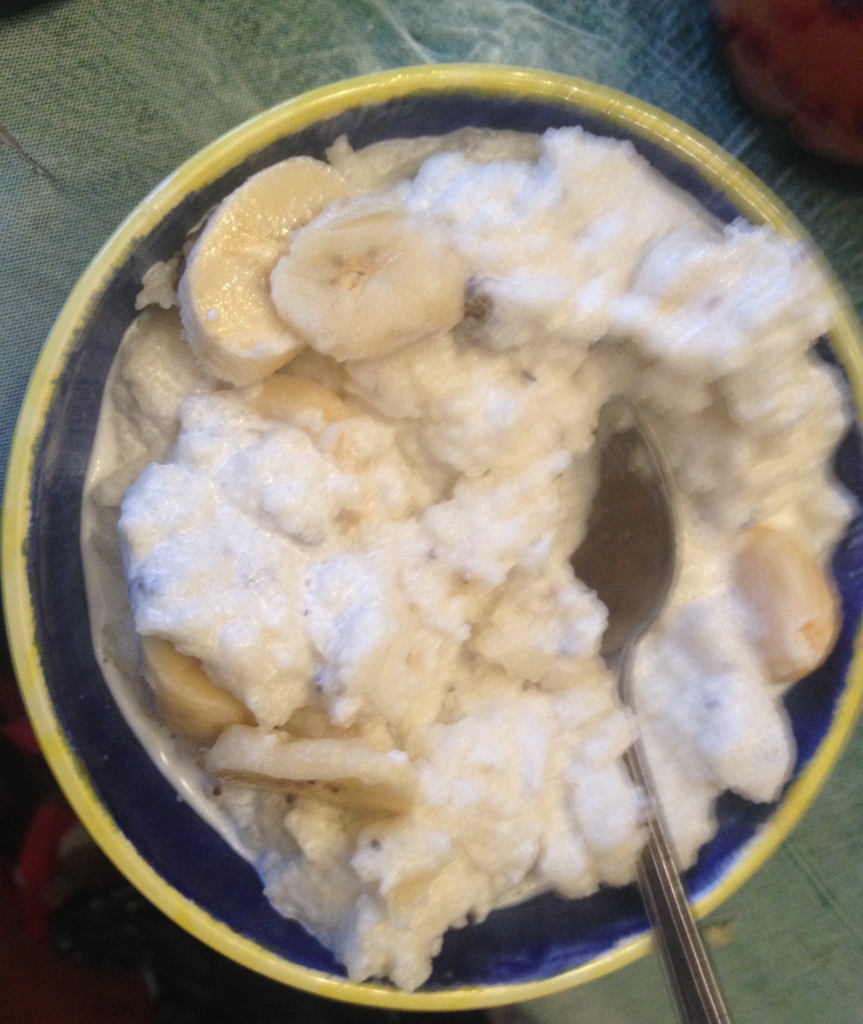 By the time that daylight had chased away the darkness, the sky was gray and the back yard was covered in water. It had rained for several days straight, and a heavy clay soil does not absorb water very well. It was time for a simple breakfast of cream of rice cereal, cooked in almond milk and light cream. The yummy additions to the cereal were golden raisins, a small red banana, hemp seeds, and flax seeds. Add a cup of tea and… voila!… breakfast for a busy morning!