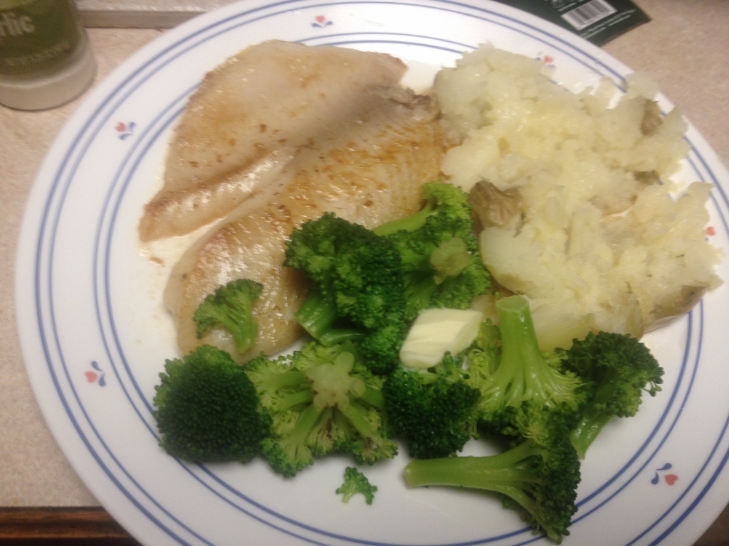 So I started this blog post with a meal, and I will end it with a meal. Dinner consisted of tilapia, a baked potato, and steamed broccoli. Yum.