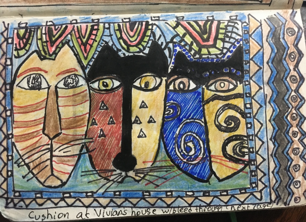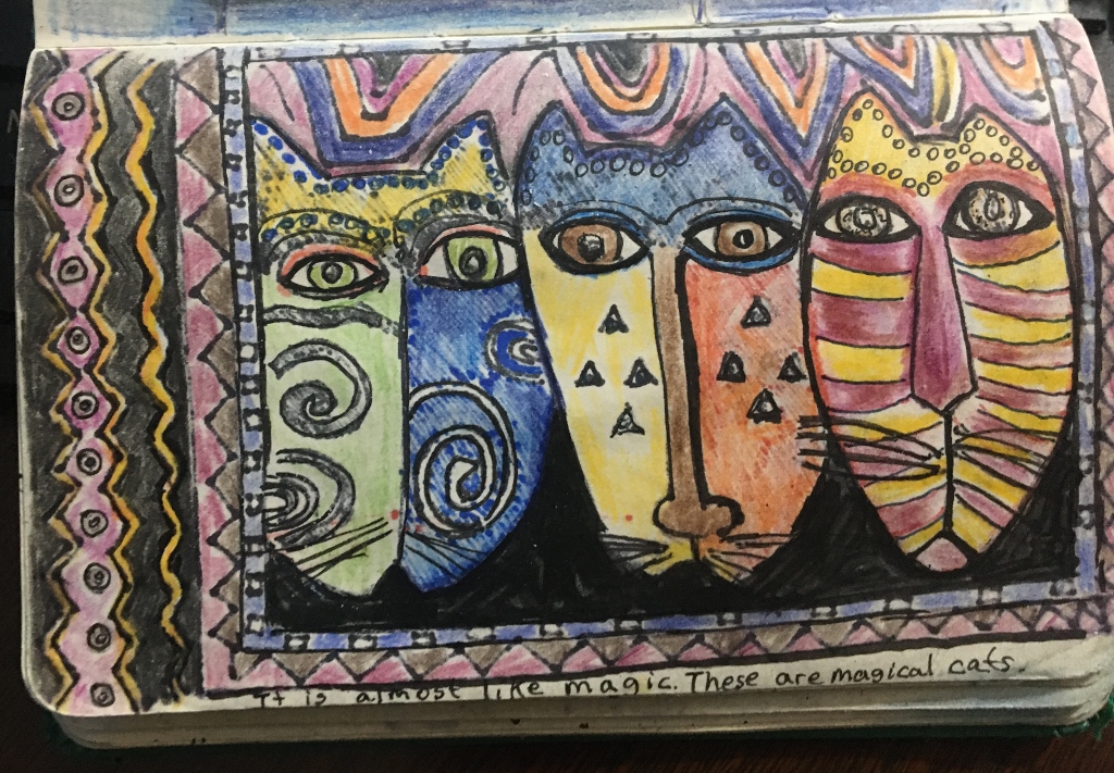 That day, I was at my sister’s house. She has a really cute pillow with pictures of cats enbroidered into the pillow. I thought that would be a cool thing to draw. Then I thought… hmm, it needs darker lines than graphite pencil. So I started using a sharpie to give the picture more definition. “Hmmm,” I thought. “I wonder if that marker bled through to the other side of the paper.” Sure enough, it had. Ugh. I can’t get rid of that. It’s bled through. That is terrible. Then I thought, oh, what a cool printmaking technique. I’ve got two pictures for the price of one. So I added color to both pictures: the original and the “print.”