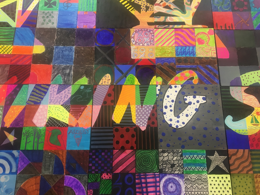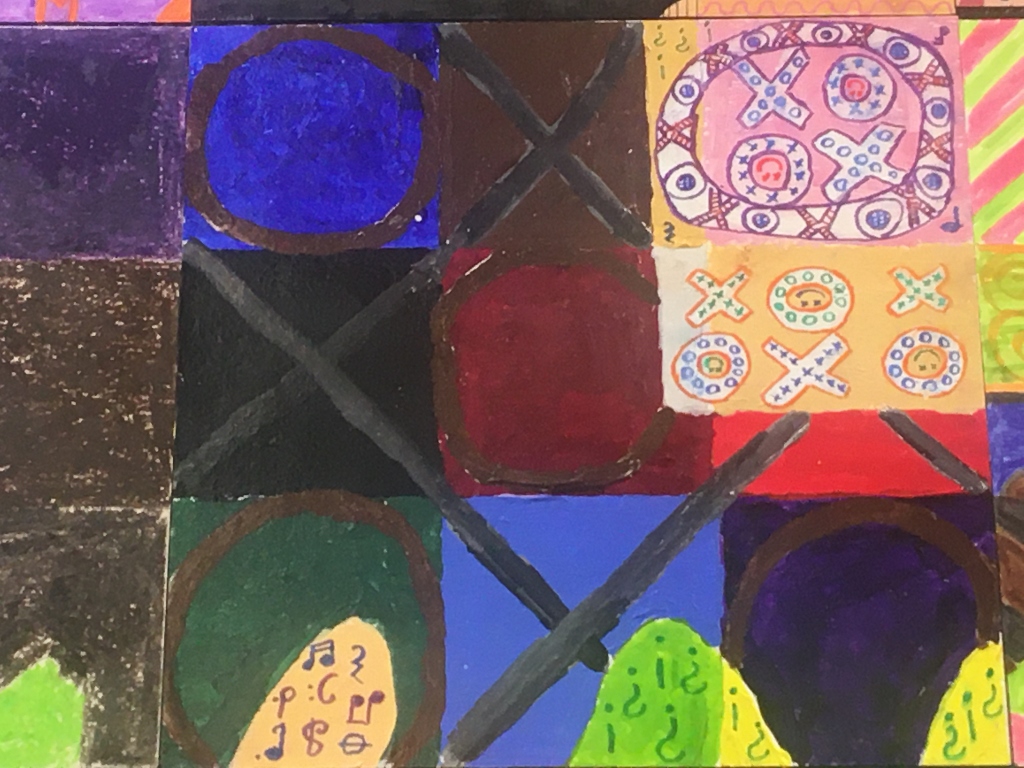 I got my portion and I began working on it. I had one week to complete it. Because I had to divide my square into nine sections, much like a tic tac toe board, I got the idea to use a tic tac toe theme. I did so with great glee and energy.