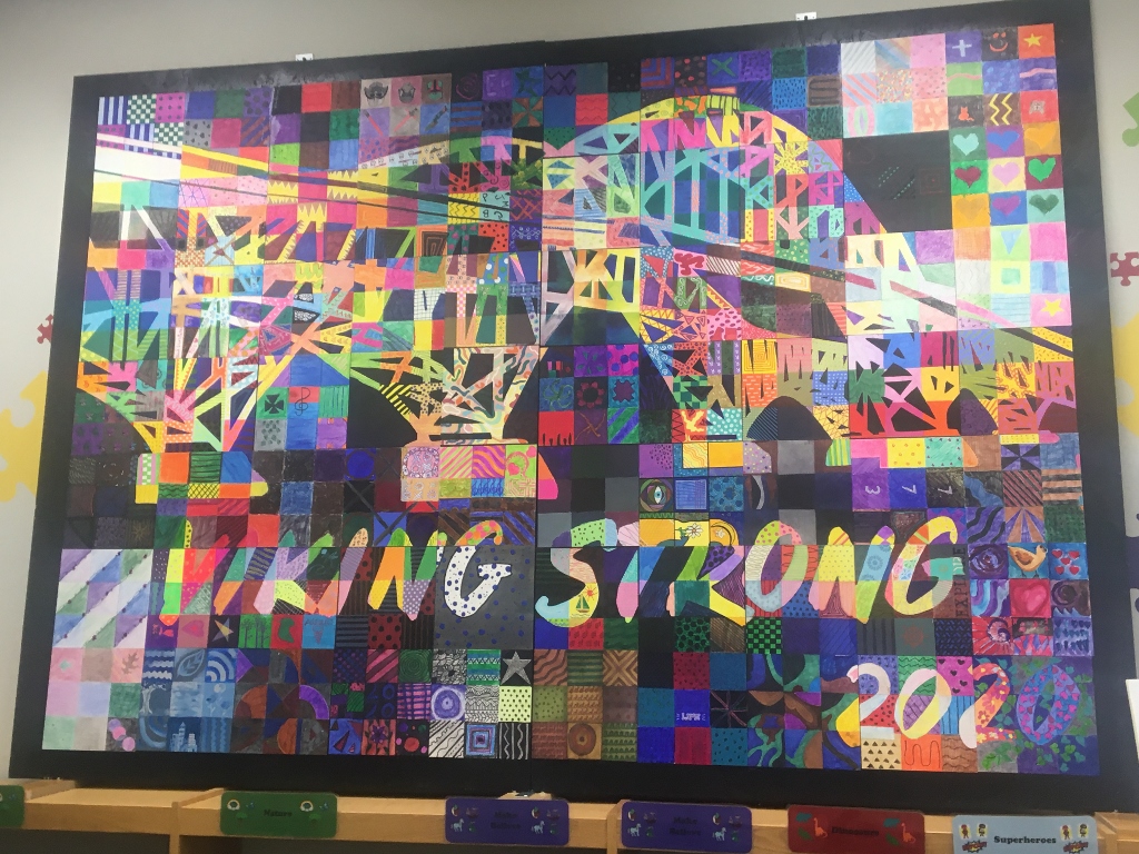 There are so many ways for humans to share their stories. We are used to the written format of the memoir. Other formats would include a graphic novel-type presentation, visual journal, and songs. Today’s pictures depict a group project, a community project, in the form of a large picture.