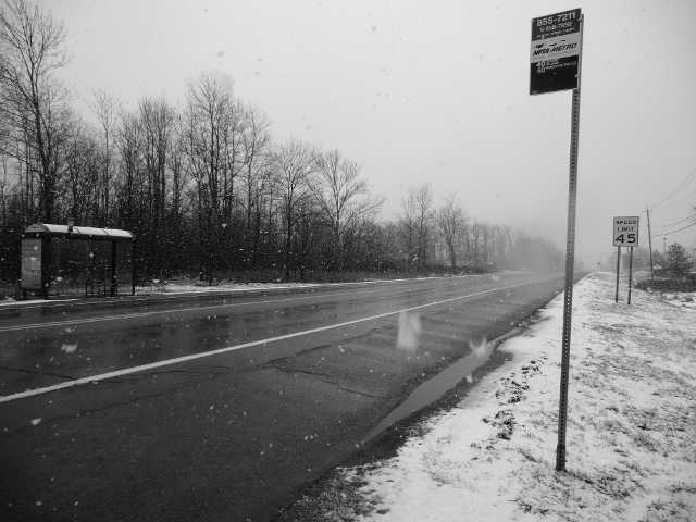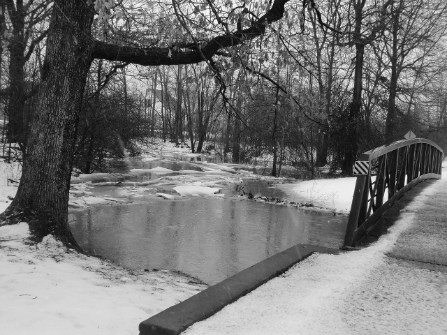So… the bike path… As I was walking down the bike path, the snow started falling. Before long, I was covered with snow. I got out the camera, set it to black and white, and I started taking pictures. Here are some views of what it looks like in winter: