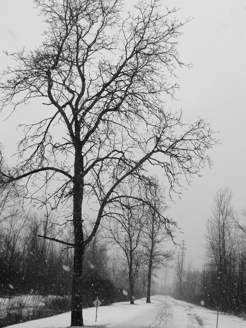 So… the bike path… As I was walking down the bike path, the snow started falling. Before long, I was covered with snow. I got out the camera, set it to black and white, and I started taking pictures. Here are some views of what it looks like in winter: