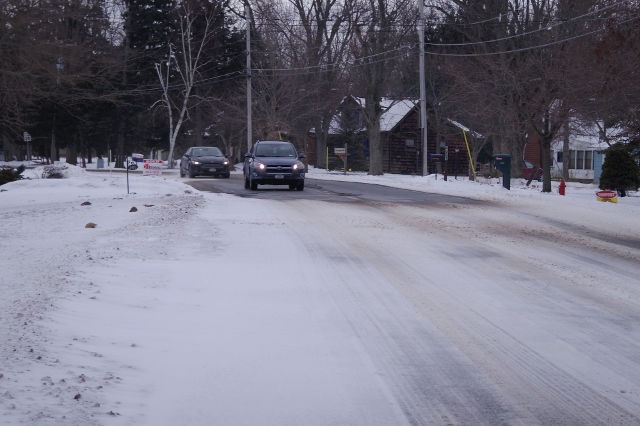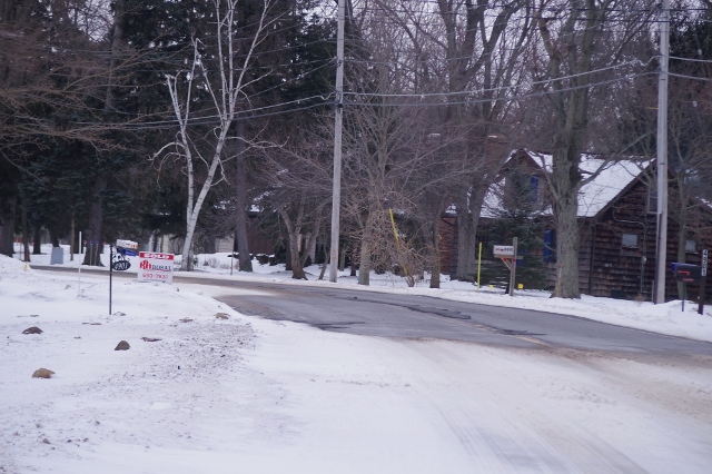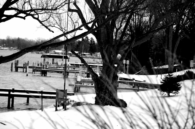 Here is a closer view of the docks, covered with snow, on a windy winter day.