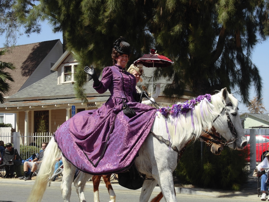 | Riding side saddle and greeting the audience at the parade. |