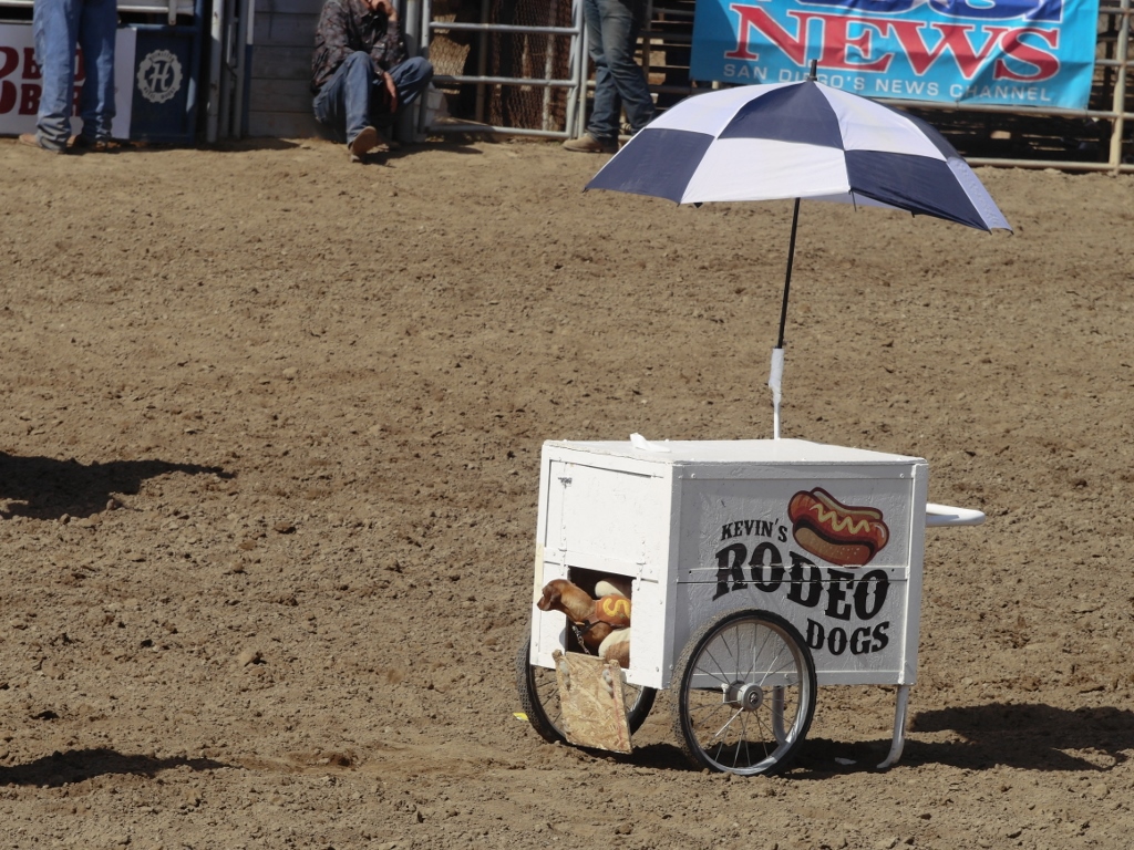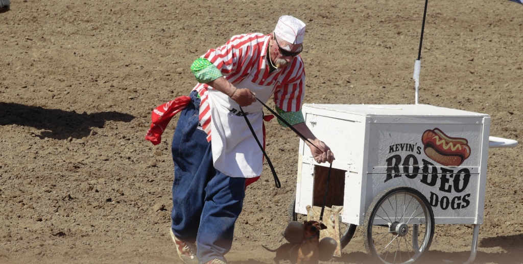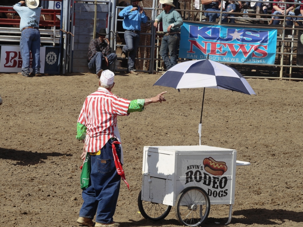 The most hilarious bit of zanyism that I’ve seen recently was at yesterday’s rodeo. It involved a hot dog vender who pushed his cart right up to the middle of the arena.